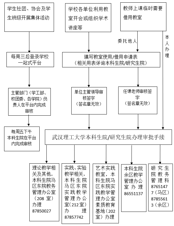 1.学生社团、协会及学生班级开展集体活动,教师需要临时借用教室,学校各单位临时利用教室进行非营利性开会或学术讲座等情形,按照日常教室借用流程办理手续,或直接联系本科生院/研究生院咨询。