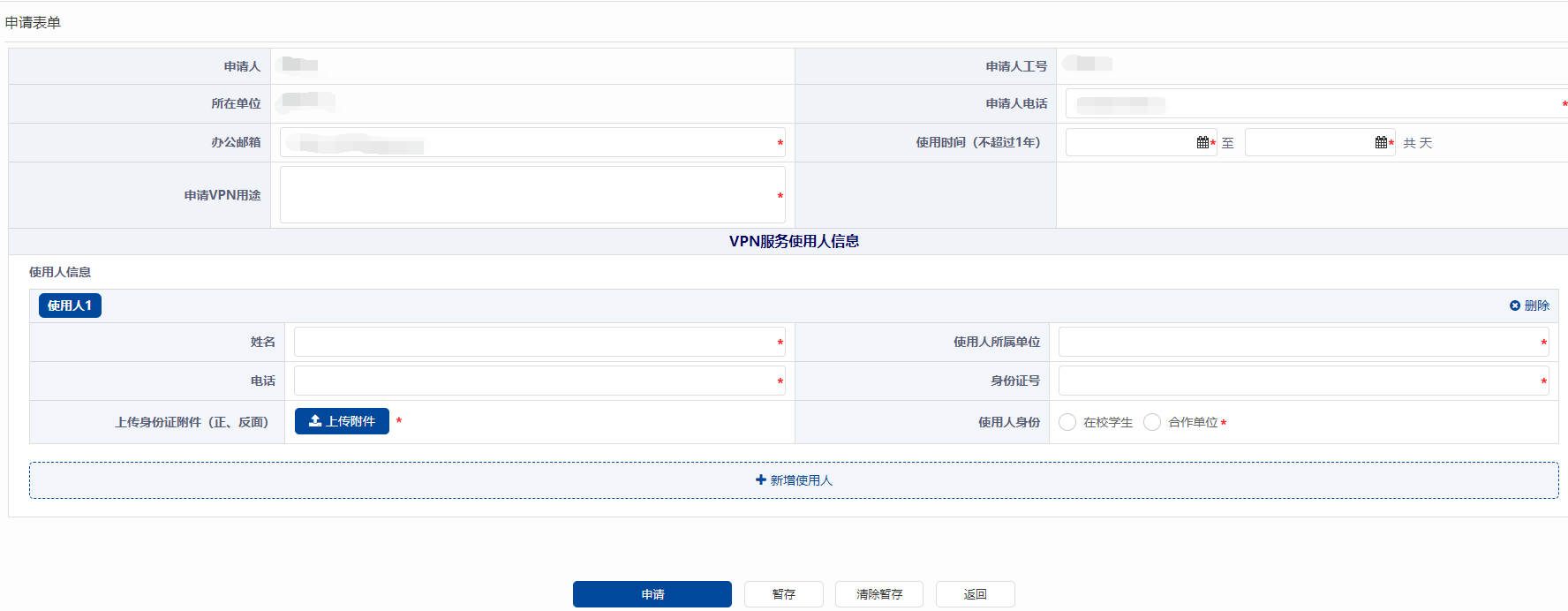临时vpn账号服务主要面向校内各单位需要为外来人员申请vpn账号使其可以在校外访问校内资源、服务器等,由相关单位申请,并由单位指定的专人进行管理,使用时长不超过一年,到期需在办事大厅“校园网/VPN账号延期申请”申请延期。
