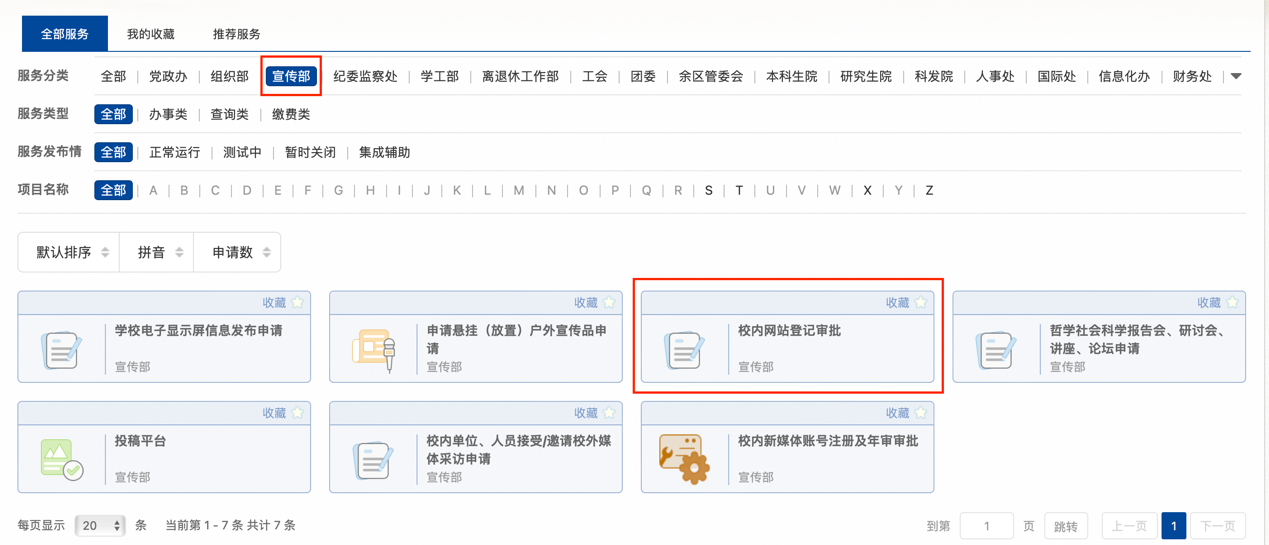 智慧理工大->办事大厅->宣传部->校内网站登记审批